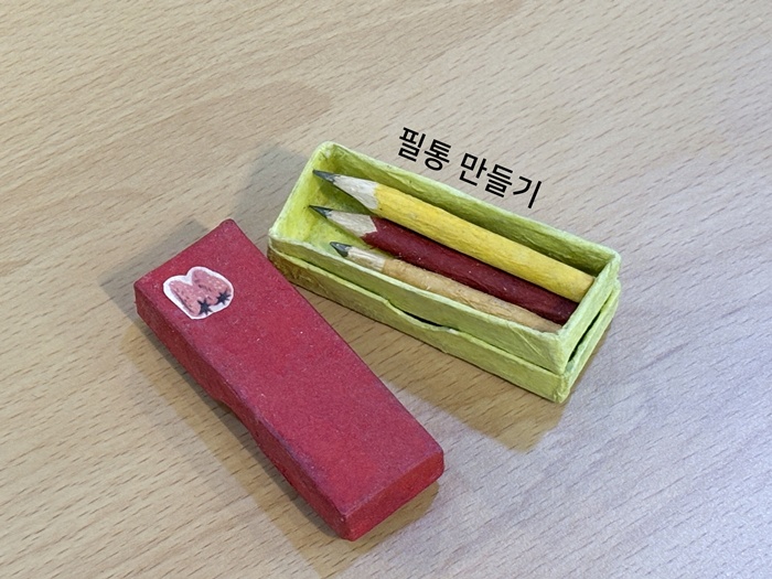인형 마무리 후 교실 소품들과 만세운동 소품 만들기를 시작해요! 오늘은 필통을 만들어 봅시다! 실제 필통보다 훨~씬 작은 크기로 만들어야해서 작은 종이를 잡고 열심히 집중하시는 모습! 틀을 만들고 안밖으로 한지를 붙여서 필통을 완성했습니다!