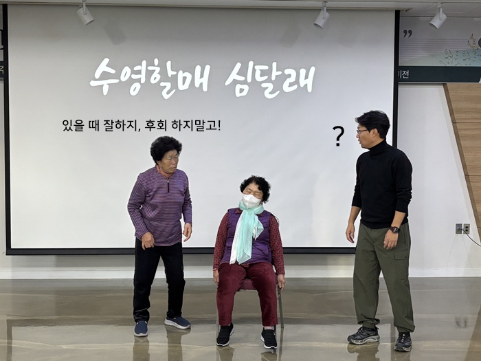 길놀이로 시작하는 '수영할매 심달래' 연습! 선생님 따라 소고치며 신나게 걸어봅니다! 오늘 참석하지 못한 배역에 선생님들이 대신 연기해주셨는데요! 선생님들의 연기를 보는 것 만으로도 재밌고, 없는 애드리브도 하게 되어 너무 즐거우셨답니다!