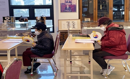 오늘은 뜨거운 여름을 맞아, 시원한 바람을 일으켜 줄 비단부채 만들기를 진행해 보았습니다.프로그램을 진행해 주실 분들은 동구 이바구 민화동아리 회원님들과 강사님이십니다.지난 봄, 재능기부 수업을 진행해 주시겠다고 연락을 주셔서 약속을 하고,오늘 드디어 만나뵈었습니다! 부귀와 영화를 상징한다는 모란꽃 부채를 만들어 보겠습니다.동그란 비단천에 도안을 따라 물감으로 잘~ 색칠해 주면 된다고 하시네요! 손이 떨려서 너무 힘들다, 못한다, 좀 해도~ 하시던 어르신들도강사님이 조금씩 도와주시고, 마무리도 예쁘게 해주시고,그래도 한 번 더 칠해서 더 예쁘게 하고 싶으시다고!!!무더위도 날려주고, 부귀 영화도 불러온다는 모란꽃 비단부채! 오늘 오길 진~짜 잘했다며, 행복한 웃음으로 인사해 주시네요!